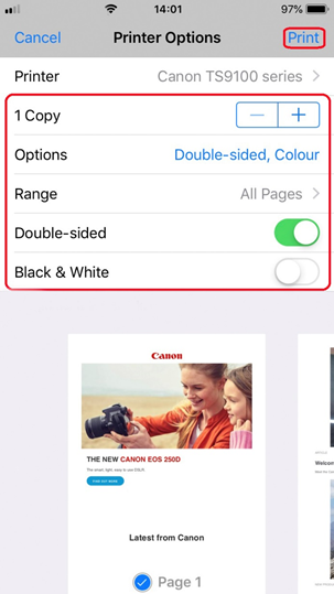 Printer options can differ depending on the app and printer you are using. Normally, when you tap print and select a model name, the displayed printer options will include up to the following four options: