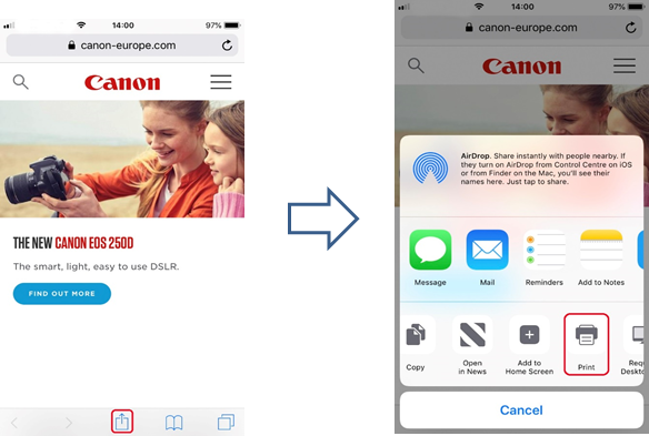 ] (depending the version of iOS you have installed) to display the menu options, and then scroll across & tap on the [Print] icon.