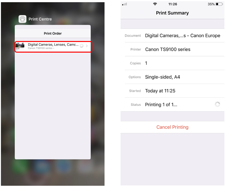 During printing the [Print Centre] icon is displayed in the list of recently used apps, which can be used to check the print progress.